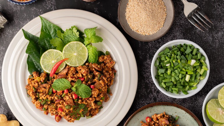 ในส่วนของวัตถุดิบหลักเราจะใช้ หมูสับ 300 กรัม, หอมแดง 5 หัว, ใบสะระแหน่, ต้นหอม 2 ต้น และพริกแห้ง (ตามความแซ่บที่ต้องการได้เลย) ส่วนเครื่องปรุงนอกจากน้ำตาล น้ำปลา น้ำมะนาว ก็ต้องมี ข้าวคั่วของเราด้วย!