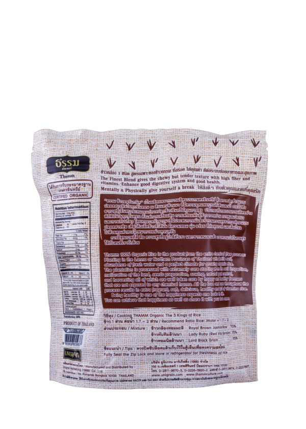 “ธรรม ข้าวออร์แกนิค” เป็นผลิตผลจากการผลิตแบบเกษตรอินทรีย์ด้วยการปลูกข้าวแบบปลอดสารพิษในทุกขั้นตอน ณ ดินแดนล้านนา ที่มีความอุดมสมบูรณ์ทั้งดินและน้ำ รวมไปถึงอากาศที่เย็นสบาย เหมาะแก่การปลูกข้าวอินทรีย์คุณภาพสูง ประกอบกับกระบวนการผลิตอย่างพิถีพิถันในทุกขั้นตอน ตั้งแต่การเตรียมดิน การเตรียมพันธุ์ข้าว การหว่าน การดูแลแปลงนา และการเก็บเกี่ยว โดยครอบครัวชาวนาที่มีประสบการณ์และร่ำรวยความสุขจากการทำนาแบบปลอดสารพิษ เพื่อให้เมล็ดข้าวที่ได้นั้น มีความหอม นุ่ม อร่อย ดีต่อสุขภาพและเต็มเปี่ยมไปด้วยคุณค่าทางโภชนาการอย่างครบครัน การมีสุขภาพดี คือ ความสุขที่อยู่ใกล้ตัวเรา นอกจากตนเองแล้ว เราควรแบ่งปันความสุขให้กับคนที่เรารักด้วยข้าวกล้อง 3 ชนิด สูตรเฉพาะของข้าวธรรม ที่อร่อย ได้คุณค่า ดีต่อระบบย่อยอาหารและสุขภาพ